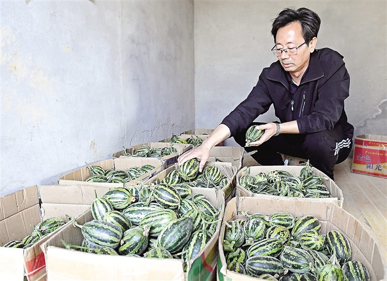 南趙扶鎮(zhèn)一家農(nóng)業(yè)示范基地的設(shè)施大棚內(nèi),農(nóng)民在分揀甜瓜。