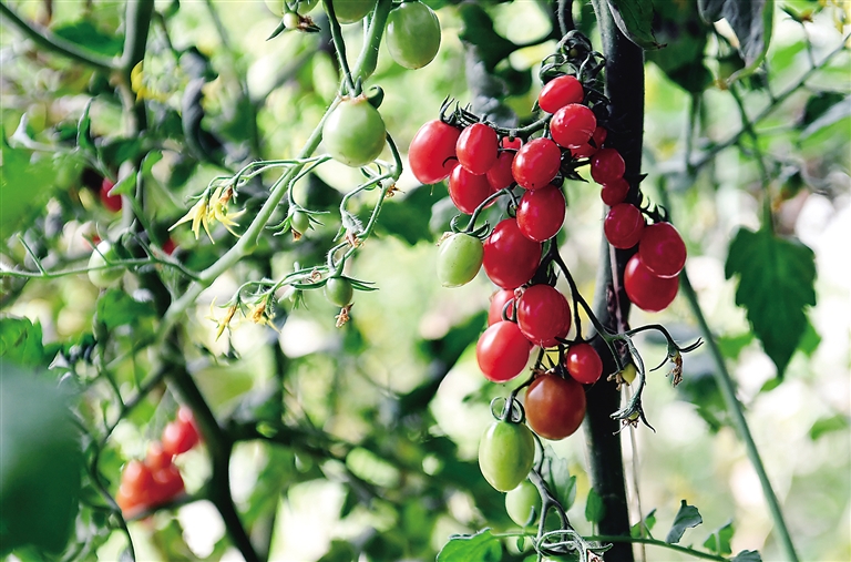 在里坦鎮(zhèn)一村一家設(shè)施大棚內(nèi)拍攝的鮮嫩欲滴的西紅柿。
