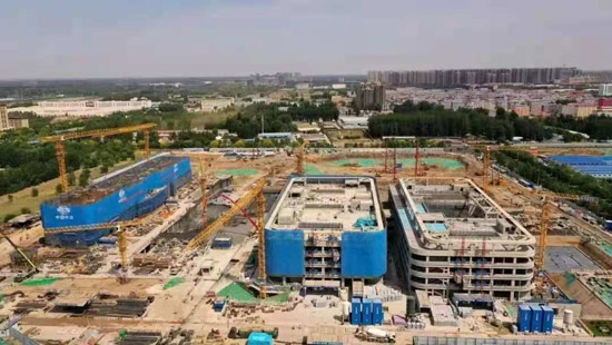 中國醫(yī)學(xué)科學(xué)院腫瘤分院(廊坊院區(qū))項目施工現(xiàn)場塔吊林立,大型工程車輛馬達(dá)轟鳴,工作人員緊張有序施工。