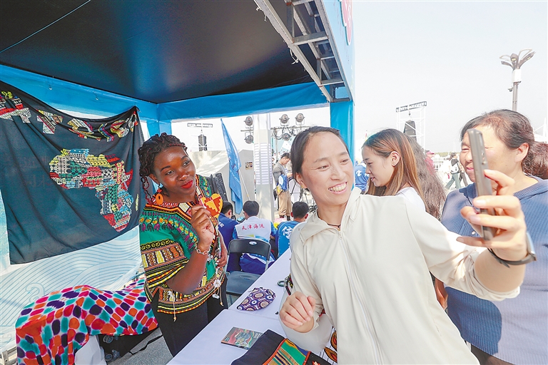 京津冀非物質(zhì)文化遺產(chǎn)博覽會(huì)烏干達(dá)手工藝品展位前,游客與工作人員合影留念。