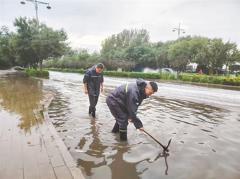 根據(jù)氣象部門7月2日發(fā)布的暴雨藍色預警,市城區(qū)防汛指揮部于7月2日17時啟動城區(qū)防汛四級應急響應,相關部門“聞雨而動”,迅速開展排水防澇、應急值守等防汛工作。市政設施管理中心及時調(diào)配抽水設備抽排文明路積水。執(zhí)法支隊各大隊、中隊執(zhí)法人員按照防汛預案要求,迅速到達地道橋、重要點位進行防汛值守,清理疏通排水口。環(huán)衛(wèi)中心及時督導三區(qū)環(huán)衛(wèi)部門積極行動,有效清理清除道路兩側(cè)水箅子周邊垃圾雜物和樹枝樹葉,排除路面積水。