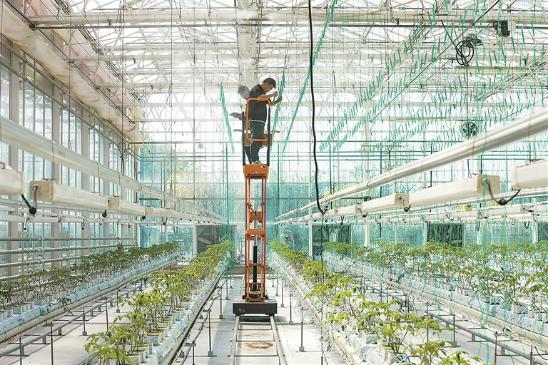 圖為在農業(yè)農村部規(guī)劃設計研究院設施農業(yè)研究所永清精準實驗基地內,工作人員為新栽種的西紅柿繞蔓。記者 王靜 通訊員 龐趁友 攝