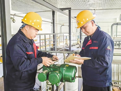 在南城熱力有限公司常甫熱力站,工作人員正認(rèn)真檢查設(shè)備運(yùn)轉(zhuǎn)情況并記錄儀表數(shù)據(jù)。記者 張歡 攝