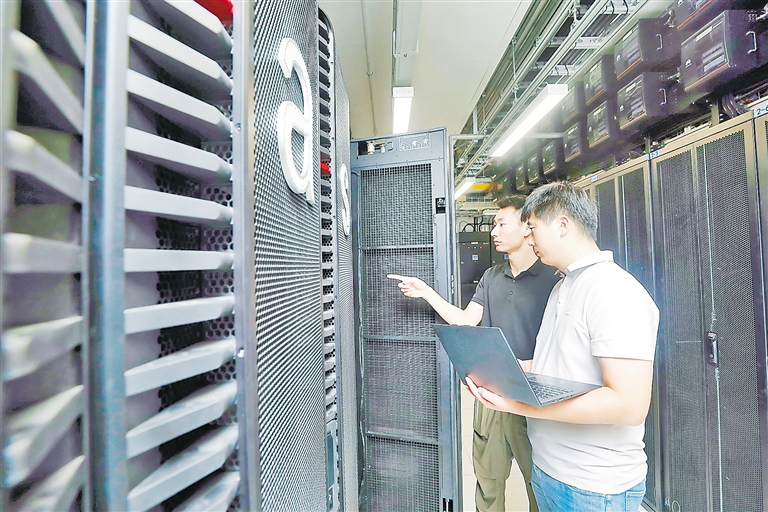 ①河北人工智能計算中心工作人員在數(shù)據(jù)機房檢查服務(wù)器運行狀態(tài)。(資料片)