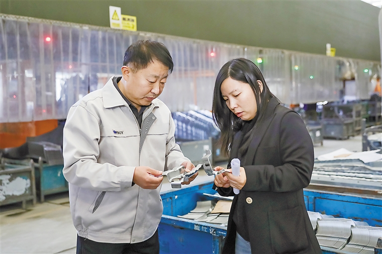 大廠高新區(qū)管委會(huì)工作人員(右)深入豐寶廣源汽車科技有限公司生產(chǎn)一線,現(xiàn)場了解情況,精準(zhǔn)對(duì)接企業(yè)需求。 記者 楊苗苗 通訊員 李浩 攝
