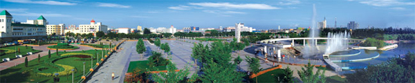 廣場(chǎng)綠化以銀杏、法桐、白蠟、油松等為主,共植樹(shù)300余株、鋪設(shè)草坪9000平方米,綠地率達(dá)60%以上。整個(gè)廣場(chǎng)均由花崗巖石材鋪設(shè),主色調(diào)為暖色,呈格狀圖案,色彩淡雅、別致。