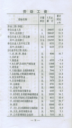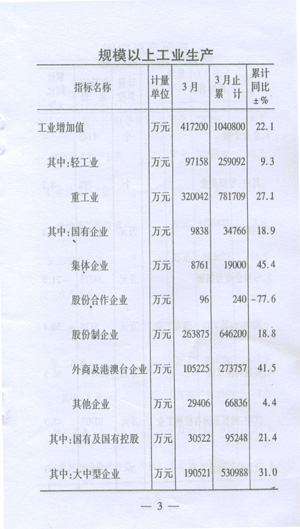 ——收入穩(wěn)步增加。一季度,城鎮(zhèn)居民人均可支配收入5424,同比增加289元,增長8.0%;在崗職工平均工資8229元,同比增加1196元,增長17.0%;初步預(yù)測農(nóng)民人均現(xiàn)金收入達(dá)到2138元,同比增加219元,增長11.4%。