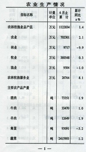 ——農(nóng)業(yè)發(fā)展平穩(wěn)。全市農(nóng)林牧漁業(yè)總產(chǎn)值112.3億元,同比增長(zhǎng)1.4%。實(shí)現(xiàn)增加值63.2億元,同比增長(zhǎng)1.6%。主要農(nóng)產(chǎn)品除禽蛋下降外,主要農(nóng)產(chǎn)品均增長(zhǎng)。其中蔬菜總產(chǎn)量241.6萬(wàn)噸,同比增長(zhǎng)1.2%。