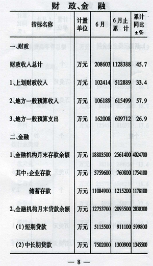 ——金融形勢(shì)平穩(wěn)。6月末,全市金融機(jī)構(gòu)本外幣口徑各項(xiàng)存款余額1880.4億元,比年初增加256.1億元。其中,居民儲(chǔ)蓄存款余額1108.5億元,比年初增加121.5億元。各項(xiàng)貸款余額1275.4億元,比年初增加209.4億元。