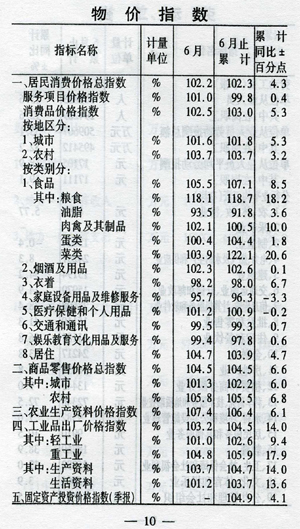 ——物價(jià)小幅上揚(yáng)。全市居民消費(fèi)價(jià)格總指數(shù)為102.3,商品零售價(jià)格總指數(shù)為104.5,漲幅同比分別上揚(yáng)4.3個(gè)和6.6個(gè)百分點(diǎn);農(nóng)業(yè)生產(chǎn)資料價(jià)格指數(shù)為106.4,工業(yè)品出廠價(jià)格指數(shù)為104.5,漲幅同比分別提高6.1和14.0個(gè)百分點(diǎn)。