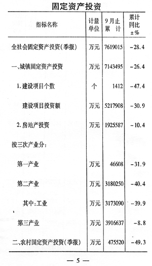 ——投資持續(xù)下降。全社會固定資產(chǎn)投資完成761.9億元,下降28.4%,與上半年相比降幅擴(kuò)大了13.3個百分點(diǎn),低于上年同期74.8個百分點(diǎn)。其中城鎮(zhèn)固定資產(chǎn)投資完成714.3億元,下降26.4%,與上月相比降幅擴(kuò)大了5.6個百分點(diǎn),低于上年同期73.3個百分點(diǎn)。其中房地產(chǎn)投資完成192.6億元,下降10.4%。