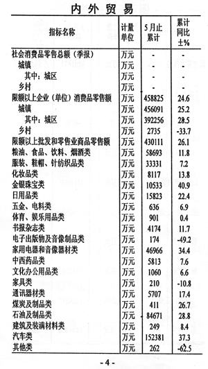——消費增長加快。限額以上社會消費品零售總額完成45.9億元,增長24.6%,與上月相比增速提高1.9個百分點。其中5月當(dāng)月增長32.2%,增速同比提高14.8個百分點。