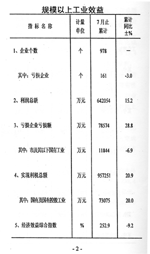 企業(yè)效益回落。前七個(gè)月規(guī)模以上工業(yè)企業(yè)實(shí)現(xiàn)利稅和利潤(rùn)分別為95.7億元和64.2億元,同比分別增長(zhǎng)20.9%和15.2%,與上半年相比增速分別回落9.3個(gè)和6.4個(gè)百分點(diǎn)。