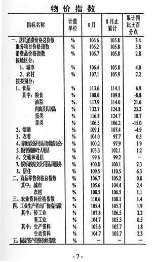 ——物價(jià)高位運(yùn)行。全市居民消費(fèi)價(jià)格總指數(shù)105.8,同比提高3.4個(gè)百分點(diǎn)。商品零售價(jià)格總指數(shù)105.2,同比提高0.8個(gè)百分點(diǎn)。農(nóng)業(yè)生產(chǎn)資料價(jià)格上漲8.1%,工業(yè)生產(chǎn)者出廠價(jià)格上漲5.7%。