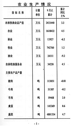 一一農(nóng)業(yè)生產(chǎn)平穩(wěn)。全市完成農(nóng)林牧漁業(yè)總產(chǎn)值243.3億元,增長3.3%,同比提高1.3個百分點,實現(xiàn)農(nóng)林牧漁業(yè)增加值129.7億元,增長3.5%,同比提高1.5個百分點。蔬菜總產(chǎn)480.1萬噸,同比增長4.7%,與上年同期相比提高3.4個百分點,牛奶產(chǎn)量增速最快為1O.O%。