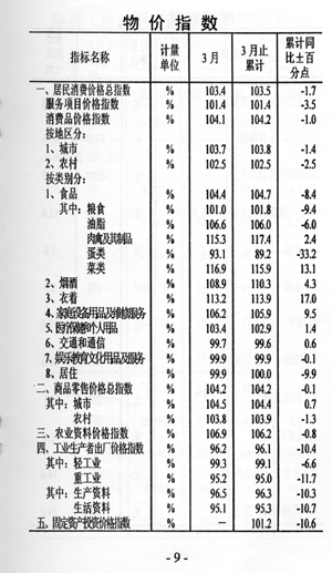 ——物價相對穩(wěn)定。一季度全市居民消費價格總指數(shù)(CPI)103.5,同比回落1.7個百分點,商品零售價格總指數(shù)104.2,同比回落0.1個百分點。農(nóng)業(yè)生產(chǎn)資料價格上漲6.2%,工業(yè)生產(chǎn)者出廠價格下降3.9%。