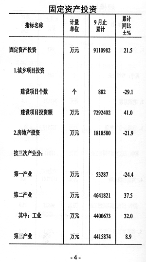 ——投資小幅回升。固定資產投資完成911.1億元,增長21.5%,與上半年相比增速提高0.6個百分點,與上年同期相比回落8.3個百分點。其中房地產業(yè)投資完成181.9億元,下降21.9%。