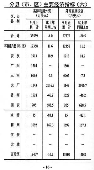——外資增速回落。實際利用外資完成33539萬美元,下降4.0%,與上年同期相比增速提高5.8個百分點。其中外商直接投資完成27772萬美元,下降20.5%。