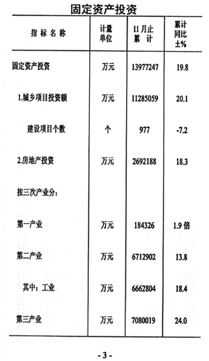 ——投資增長(zhǎng)較快。全市完成固定資產(chǎn)投資1397.7億元,增長(zhǎng)19.8%,與1-10月份相比增速回落0.5個(gè)百分點(diǎn)。其中,房地產(chǎn)開(kāi)發(fā)投資增完成269.2億元,增長(zhǎng)18.3%。第一產(chǎn)業(yè)完成投資18.4億元,增長(zhǎng)1.9倍;第二產(chǎn)業(yè)完成投資671.3億元,增長(zhǎng)13.8%;第三產(chǎn)業(yè)完成投資708.0億元,增長(zhǎng)24.0%。