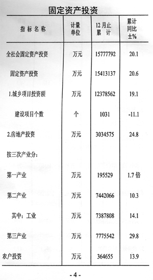 ——投資較快增長。全社會固定資產(chǎn)投資完成1577.8億元,增長20.1%,增速比上年回落0.6個百分點。其中,固定資產(chǎn)投資完成1541.3億元,增長20.6%。房地產(chǎn)開發(fā)投資完成303.5億元,增長24.8%。分產(chǎn)業(yè)看,第一產(chǎn)業(yè)19.6億元,增長1.7倍;第二產(chǎn)業(yè)744.2億元,增長10.3%;第三產(chǎn)業(yè)777.6億元,增長29.8%。