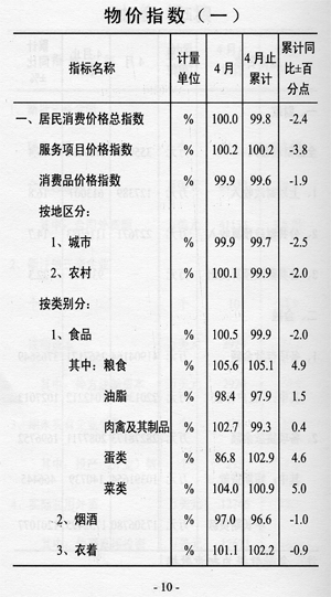 ——物價(jià)低位運(yùn)行。全市居民消費(fèi)價(jià)格總指數(shù)99.8,同比回落2.4個(gè)百分點(diǎn);商品零售價(jià)格總指數(shù)98.8,同比回落2.3個(gè)百分點(diǎn);農(nóng)業(yè)生產(chǎn)資料價(jià)格指數(shù)101.0,同比提高1.2個(gè)百分點(diǎn);工業(yè)生產(chǎn)者出廠價(jià)格指數(shù)94.9,同比回落1.0個(gè)百分點(diǎn)。
