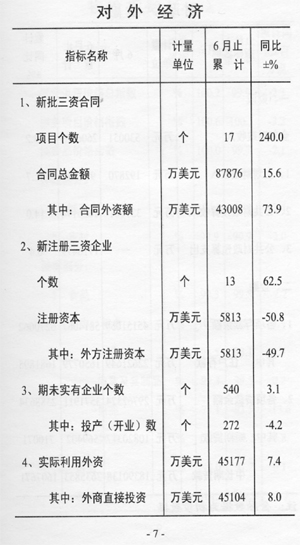 ——外資增速加快。全市實際利用外資完成45177萬美元,同比增長7.4%,比1-5月份提高70.3個百分點。其中,外商直接投資完成45104萬美元,增長8.0%。