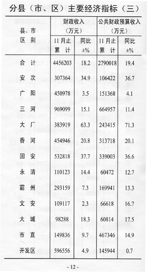 ——財政快速增長。全部財政收入完成445.6億元,同比增長18.2%,增速比1-10月份提高1.5個百分點,比上年同期提高2.0個百分點。其中:公共財政預(yù)算收入279.0億元,增長19.4%,增速比1-10月份提高1.8個百分點,比上年同期回落0.9個百分點。