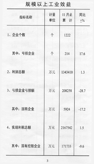 工業(yè)效益回升。1-11月份,規(guī)模以上工業(yè)實現(xiàn)利潤總額134.3億元,同比下降9.6%,比1-10月份回升2.2個百分點。實現(xiàn)利稅總額216.8億元,增長1.5%,比1-10月份回升3.0個百分點。