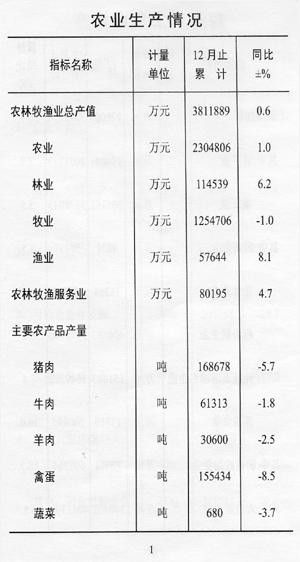 ——農(nóng)業(yè)生產(chǎn)基本平穩(wěn)。農(nóng)林牧漁業(yè)總產(chǎn)值預計完成381.2億元,同比增長0.6%。分品種看,糧食總產(chǎn)量160.7萬噸,下降5.4%;蔬菜產(chǎn)量679.6萬噸,下降3.7%;豬肉產(chǎn)量16.9萬噸,下降5.7%,牛肉產(chǎn)量6.1萬噸,下降1.8%,羊肉產(chǎn)量3.1萬噸,下降2.5%;禽蛋產(chǎn)量15.5萬噸,下降8.5%。