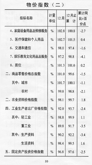 ——物價低位運行。居民消費價格總指數(shù)100.3,同比回落1.3個百分點:商品零售價格總指數(shù)99.6,回落1.5個百分點;農(nóng)業(yè)生產(chǎn)資料價格指數(shù)99.7,回落1.8個百分點;工業(yè)生產(chǎn)者出廠價格指數(shù)93.7,回落2.4個百分點。