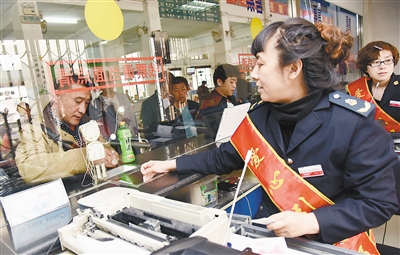 4月19日,市長途汽車站售票大廳售票員熱心為旅客做好售票服務工作。 記者 李建國 攝