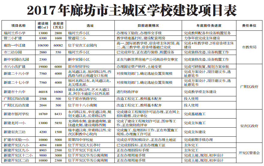 目前,各項目正在有條不紊地推進,管道二小擴建工程、廊坊市銀河學(xué)校、安次區(qū)職教中心幼教實訓(xùn)樓、開發(fā)區(qū)八小、九小等多個學(xué)校年底前將完成主體施工。
