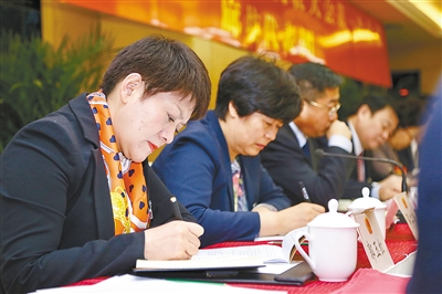 1月24日,省十三屆人大一次會(huì)議廊坊代表團(tuán)第一次全體會(huì)議上,參會(huì)代表認(rèn)真記錄會(huì)議精神。記者 賈珺 攝