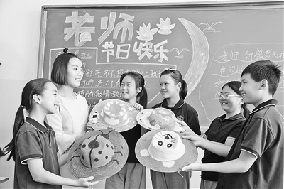 為迎接教師節(jié)的到來,永清縣第五中學舉行“說聲‘老師辛苦了’”主題活動,表達對老師的節(jié)日祝福。圖為9月7日,該校的馬亞娜老師(左二)課間感受到了一份驚喜,學生們手拿親手繪制的“草帽畫”,向老師道一聲“老師辛苦了”。