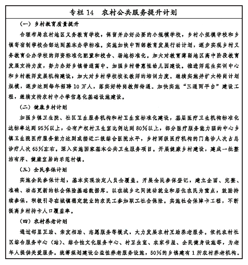 繼續(xù)把國家社會事業(yè)發(fā)展的重點(diǎn)放在農(nóng)村,促進(jìn)公共教育、醫(yī)療衛(wèi)生、社會保障等資源向農(nóng)村傾斜,逐步建立健全全民覆蓋、普惠共享、城鄉(xiāng)一體的基本公共服務(wù)體系,推進(jìn)城鄉(xiāng)基本公共服務(wù)均等化。