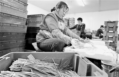 近年來,香河縣引進(jìn)蔬菜栽培新技術(shù)、新品種,大力發(fā)展現(xiàn)代農(nóng)業(yè)種植,大面積培育種植多種蔬菜,成為供給京津冀的“菜籃子”。其中,香河縣鮮速達(dá)蔬菜產(chǎn)銷專業(yè)合作社擁有蔬菜種植面積500畝、社員12戶,與周邊村民合作種植面積2000畝,蔬菜種類30余種。2007年3月與北京京客隆商業(yè)股份有限公司簽訂了長期的購銷合同,至今已實現(xiàn)了48家農(nóng)超對接直送門店。圖為香河縣鮮速達(dá)工作人員在分裝韭菜。