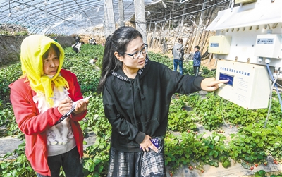 近年來(lái),廣陽(yáng)區(qū)將扶貧開(kāi)發(fā)與現(xiàn)代農(nóng)業(yè)統(tǒng)籌推進(jìn),積極為農(nóng)民開(kāi)辟精準(zhǔn)扶貧新渠道,以現(xiàn)代農(nóng)業(yè)產(chǎn)業(yè)建設(shè)為抓手,以科技創(chuàng)新引領(lǐng)精準(zhǔn)扶貧,組織科技人員下鄉(xiāng)指導(dǎo),面對(duì)面教授群眾種植技術(shù),從而進(jìn)一步拓展農(nóng)民創(chuàng)業(yè)致富的途徑,實(shí)行科技成果普惠村民,帶動(dòng)農(nóng)民就近就業(yè)、多渠道增收,讓農(nóng)民真正享受發(fā)展成果。圖為在廣陽(yáng)區(qū)北旺鄉(xiāng)潤(rùn)寶農(nóng)業(yè)基地,市氣象局工作人員指導(dǎo)農(nóng)民如何利用智能溫室物聯(lián)網(wǎng)采集器監(jiān)測(cè)棚內(nèi)空氣和土壤相關(guān)數(shù)據(jù)。