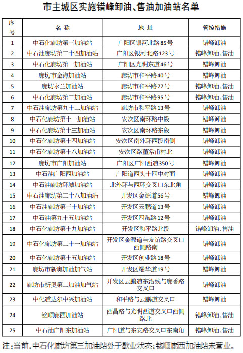 據(jù)了解,市主城區(qū)有25家加油站列入錯(cuò)峰卸油管控名單,每日8時(shí)至20時(shí)禁止卸油,卸油過程不得出現(xiàn)滲漏、滴漏現(xiàn)象。其中有6家人口密集區(qū)的加油站在執(zhí)行錯(cuò)峰卸油管控措施的同時(shí),被列入錯(cuò)峰售油管控名單,每日10時(shí)至18時(shí)全面停止售油,分別為中石化廊坊第二加油站、廊坊永蘭加油站、中石油廣陽東加油站、中石油廊坊第二十四加油站、銘順廊西加油站(未營業(yè))、中石化廊坊第十九加油站。請(qǐng)市民朋友合理做好加油安排。