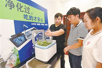 在河北蟻巢創(chuàng)客空間有限公司,創(chuàng)業(yè)者向創(chuàng)客空間工作人員展示空氣凈化裝置功能。記者 劉向 攝