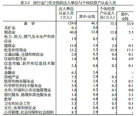 在法人單位從業(yè)人員中,位居前三位的行業(yè)是:制造業(yè)40.0萬(wàn)人,占32.3%;建筑業(yè)15.0萬(wàn)人,占12.1%;批發(fā)和零售業(yè)13.2萬(wàn)人,占10.6%。在個(gè)體經(jīng)營(yíng)戶從業(yè)人員中,位居前三位的行業(yè)是:批發(fā)和零售業(yè)35.9萬(wàn)人,占17.5%;制造業(yè)13.8萬(wàn)人,占5.5%;住宿和餐飲業(yè)9.4萬(wàn)人,占4.9%(詳見(jiàn)表2-5)。