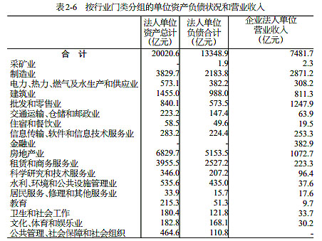 注:表中合計(jì)數(shù)含從事農(nóng)、林、牧、漁專業(yè)及輔助性活動(dòng)的單位數(shù)據(jù)。表中企業(yè)法人單位,包括機(jī)構(gòu)類型為企業(yè)的法人單位,以及執(zhí)行企業(yè)會(huì)計(jì)制度的事業(yè)法人單位、民辦非企業(yè)法人單位和基金會(huì),農(nóng)民專業(yè)合作社,農(nóng)村集體經(jīng)濟(jì)組織和除宗教活動(dòng)場(chǎng)所以外的機(jī)構(gòu)類型為其他組織機(jī)構(gòu)的法人單位。表中資產(chǎn)總計(jì)、負(fù)債合計(jì)數(shù)不含金融業(yè)數(shù)據(jù)。