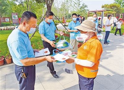 出租車司機(jī)在瑞豐公園為過(guò)往市民發(fā)放宣傳資料和文明手冊(cè)。 記者 李泳辰 攝